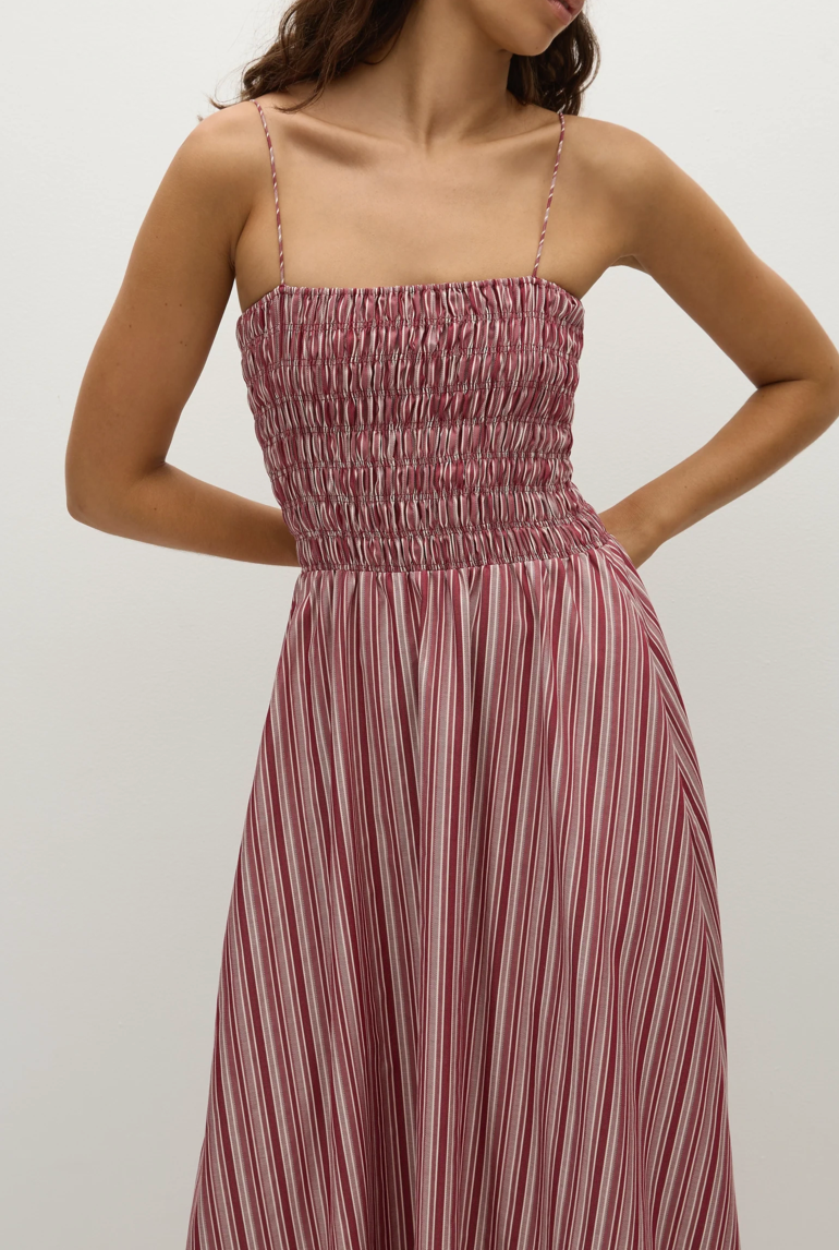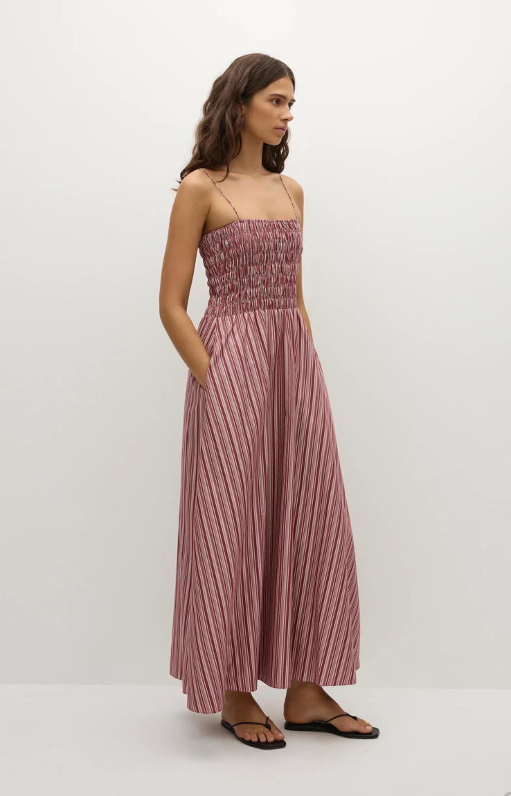 A vacation-inspired maxi dress with a straight neckline and thin delicate straps, adjustable in length. The bodice is fitted but shirred, offering additional stretch, before falling into a gathered waist with an A-line skirt that crops around the ankles. Designed from 100% BCI Certified organic cotton in a warm burgundy stripe, style with a simple sandal for effortless throw-on wear. - 100% BCI Certified Cotton OEKO-TEX Standard 100 Certified - Maxi dress - Straight neckline - Thin adjustable straps - Shirred bodice - Gathered waist - A-line skirt - Unlined
