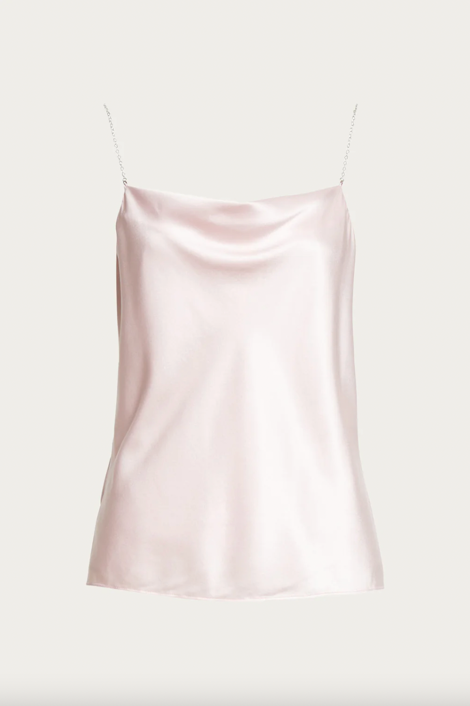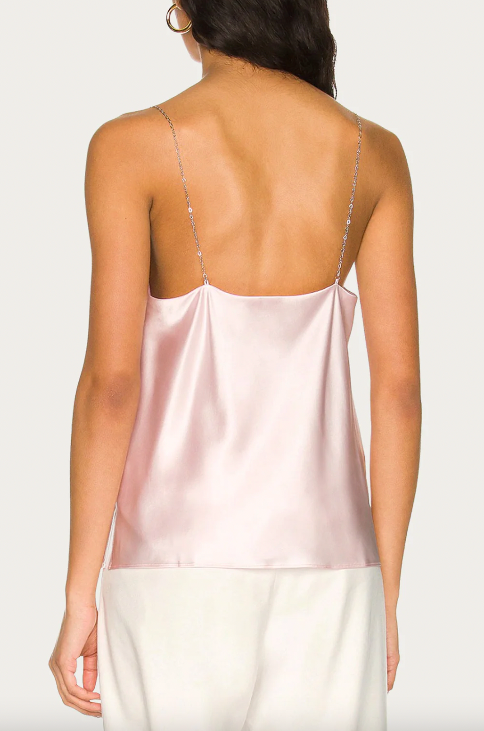 Introducing the Busy Heart Cami- perfect for adding a touch of playful elegance. Made of lustrous stretch-silk, this camisole features charming heart chain straps and a cowl neckline to highlight your décolletage. Available in soft pink, dress up jeans or elevate a soft suit with this versatile piece.