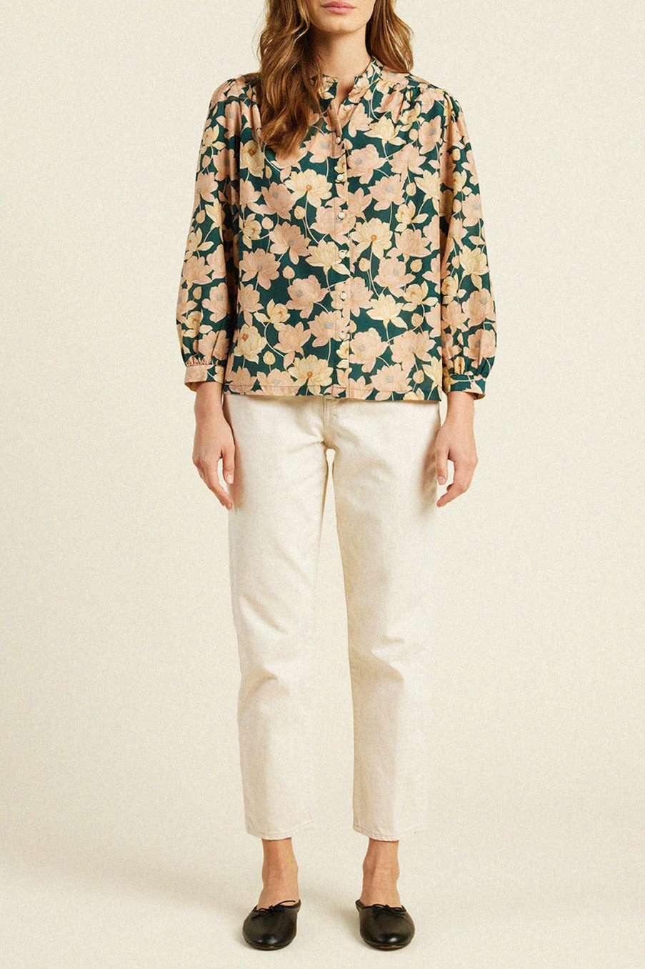 The Clara Blouse is a button-front update to the favorite Bailey Blouse with billowy shoulder gathers, a clean standing collar and bracelet-length buttoned sleeves. Includes our signature back detail with a gathered waist tab. Shown here in Jasper Twilight and made from our cotton silk.