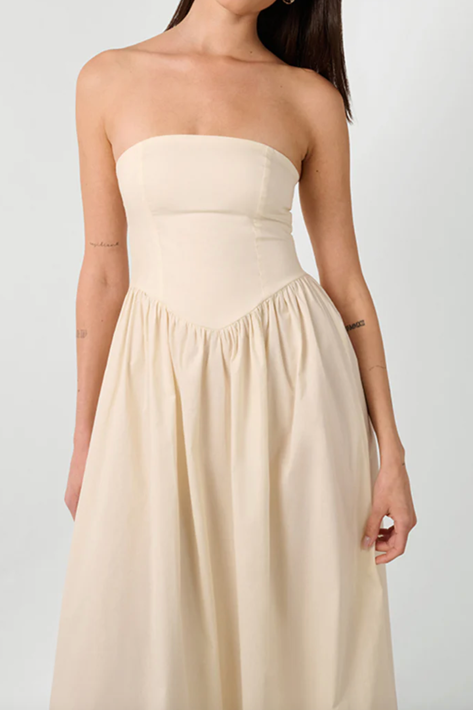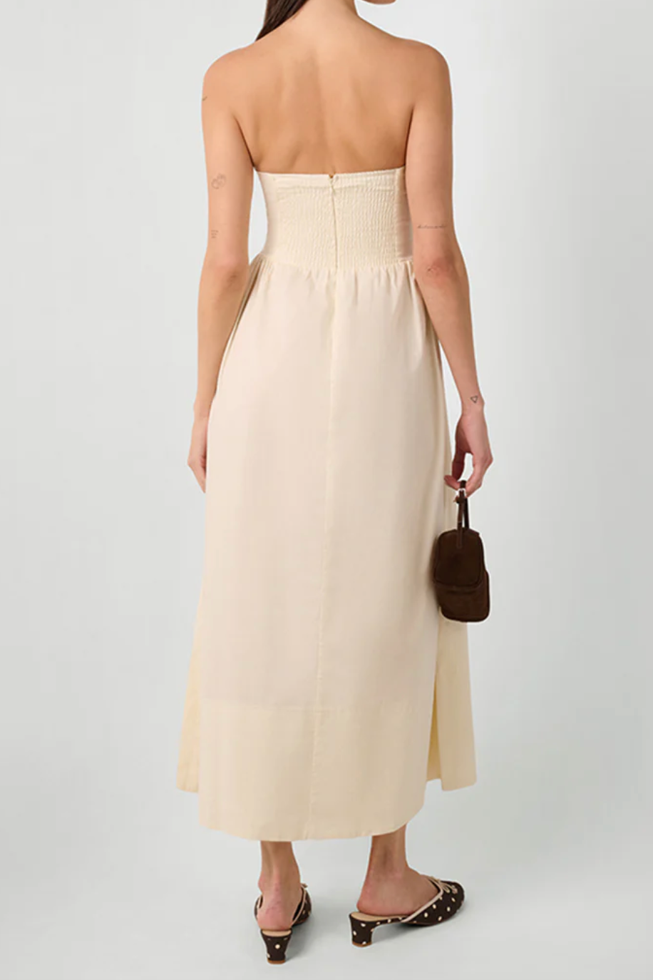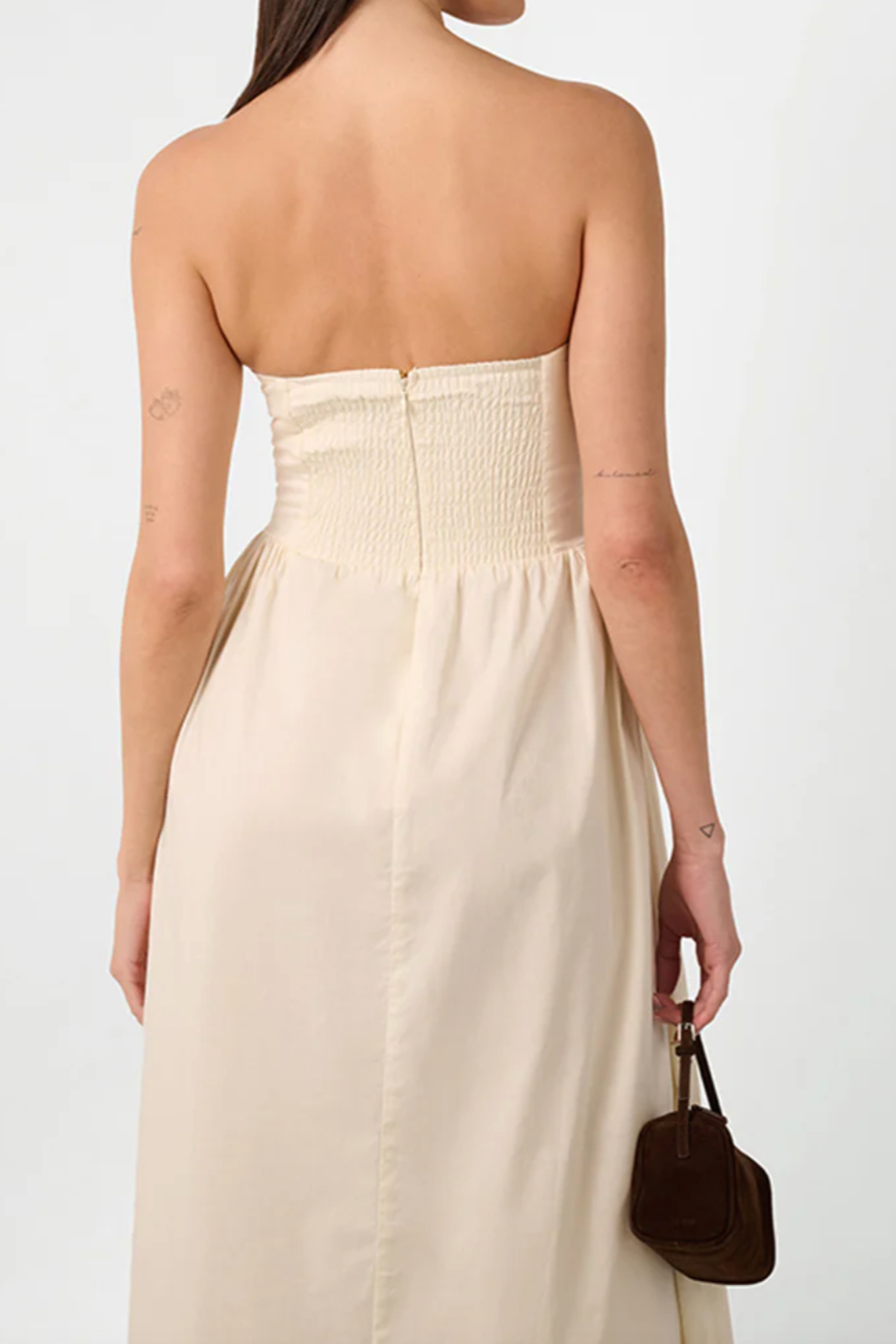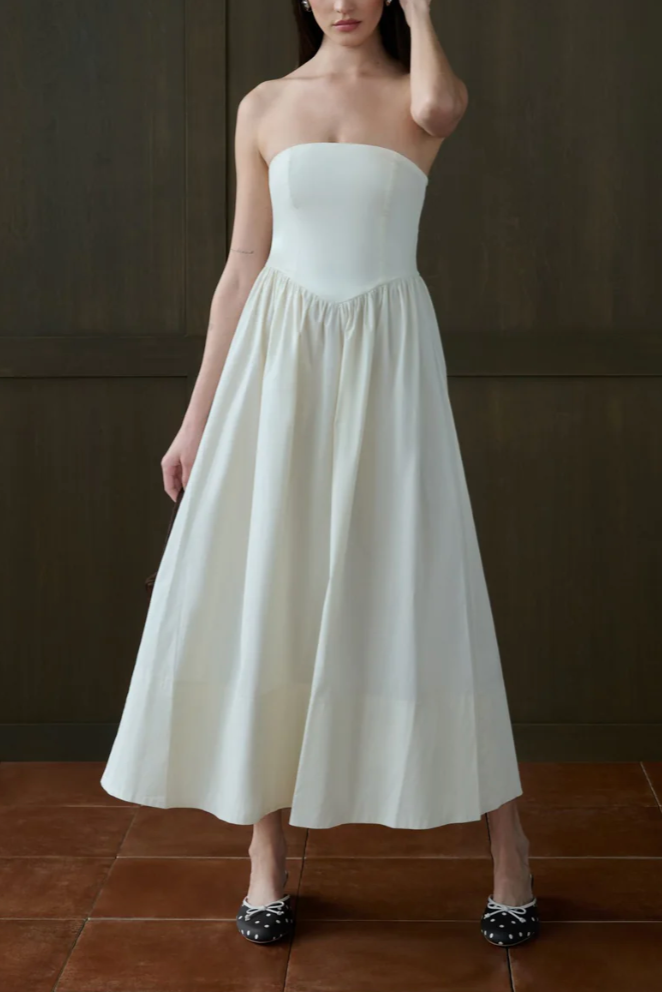 This cotton poplin maxi dress has a strapless, corset-style bodice, a curved waist seam, and a full skirt. An invisible zip details the smocked back panel.