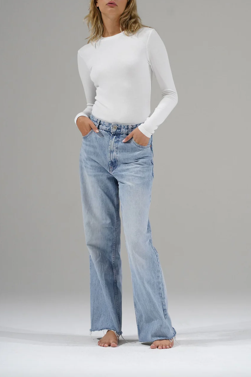 Fitted pullover top with a crew neckline. Buttery soft, light, and body-hugging. Full length with second-skin feel that can be tucked in or sit ruched at the waistline.