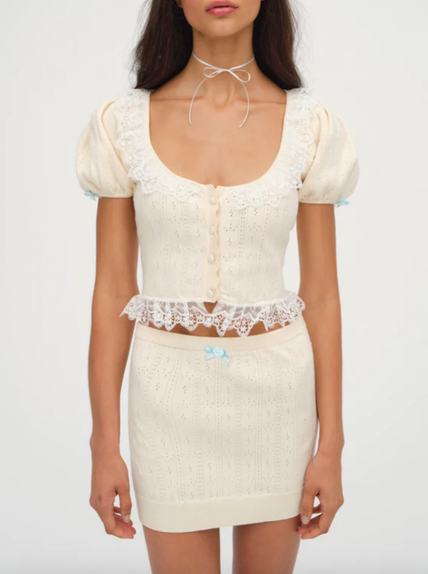 Spring into style with Daniela Knit Top - a charming cropped sweater with short puff sleeves, lace trim, and blue rosettes.