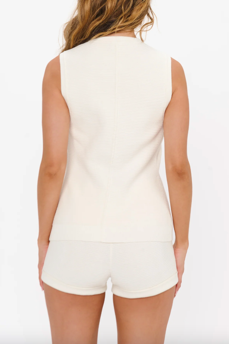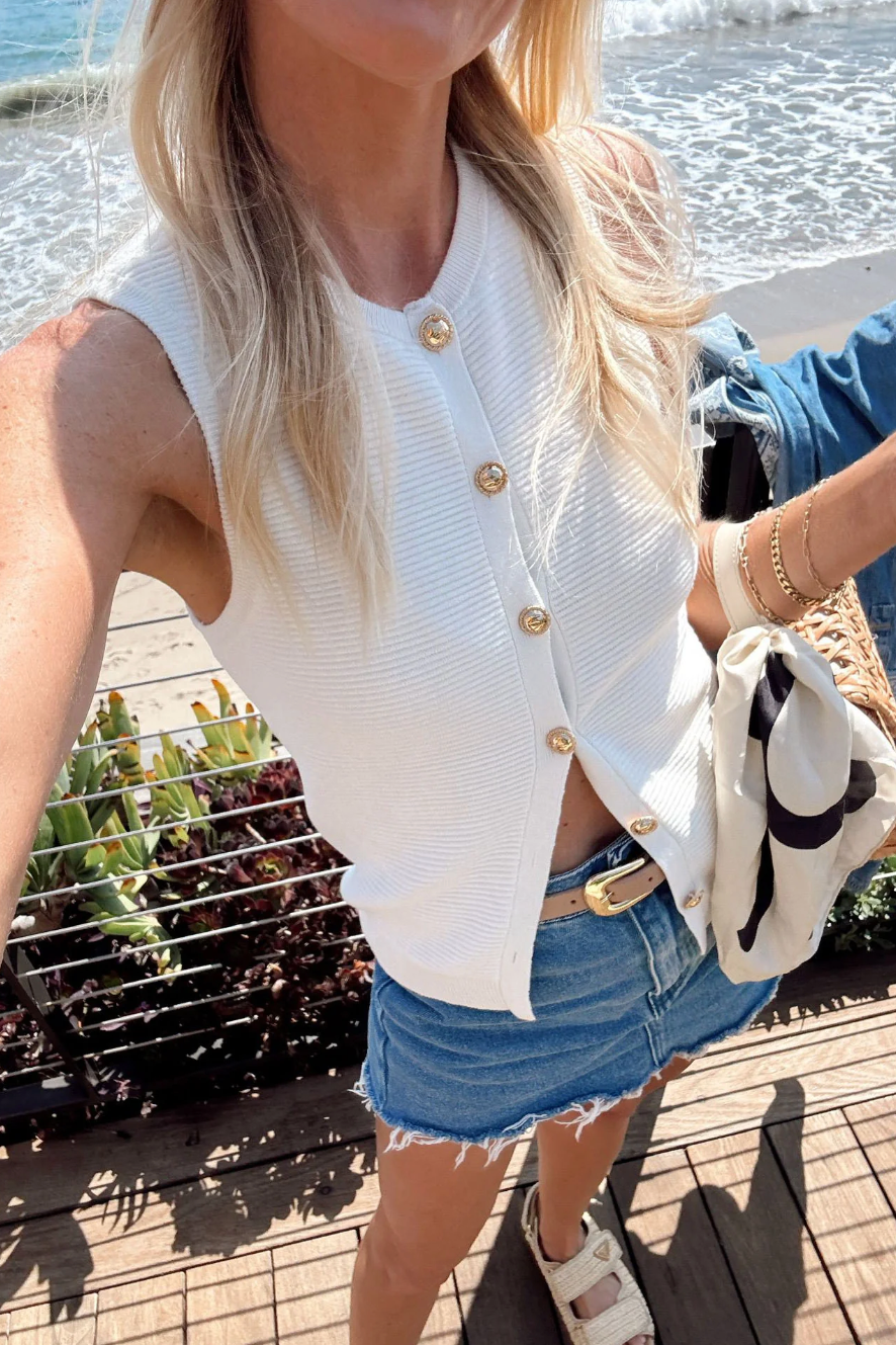 The Devin Tank is a timeless classic! In crisp white with elevated gold buttons, this knit top has the perfect weight for a polished, effortless look. Pair it with the matching shorts for a chic set, or style it with denim and ballet flats for a sophisticated everyday vibe.