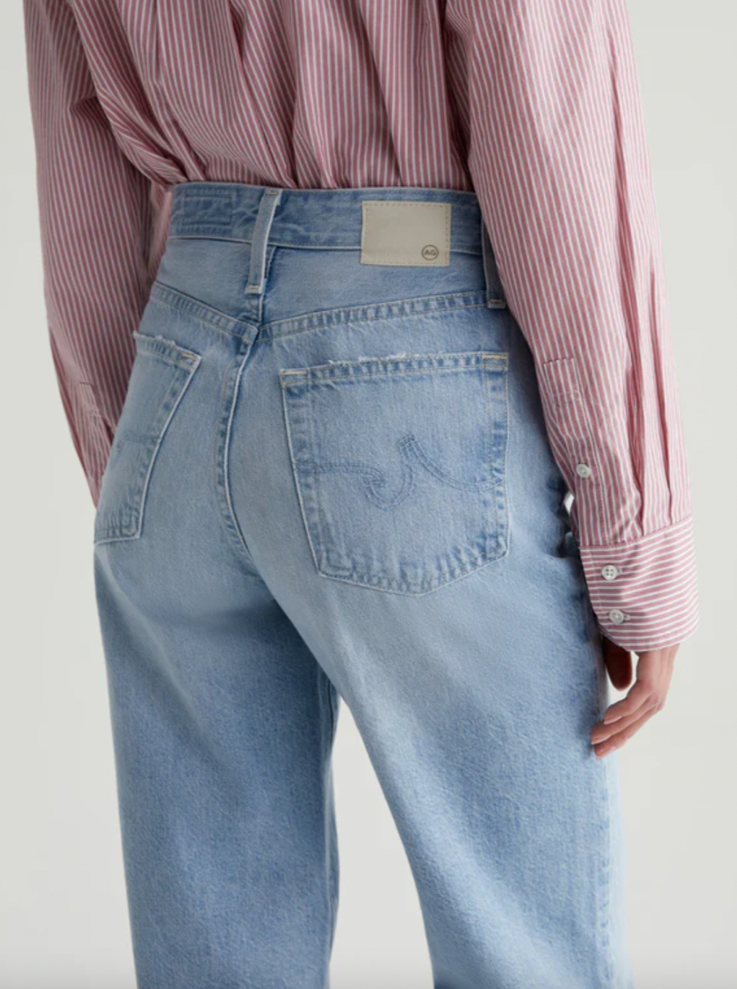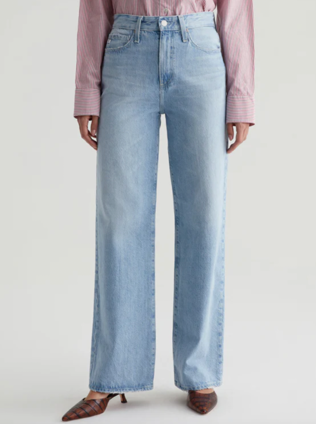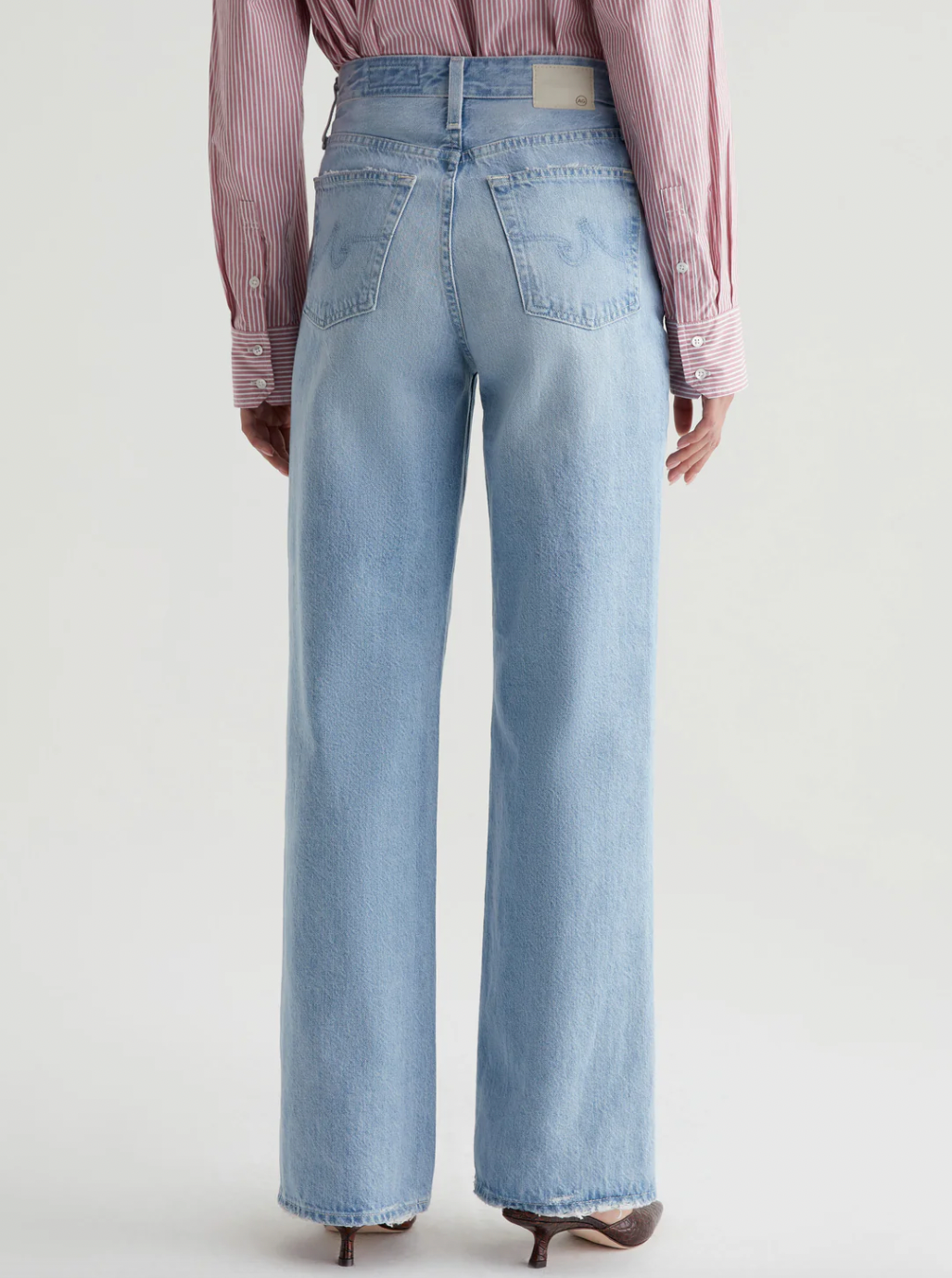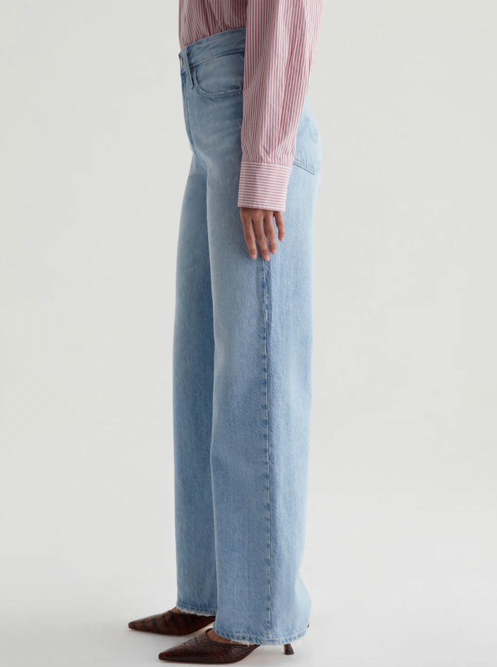 Kora High Rise Wide Leg jeans feature 13 oz. Sioux Rigid Denim, 100% cotton, and a light blue stonewash with vintage details.