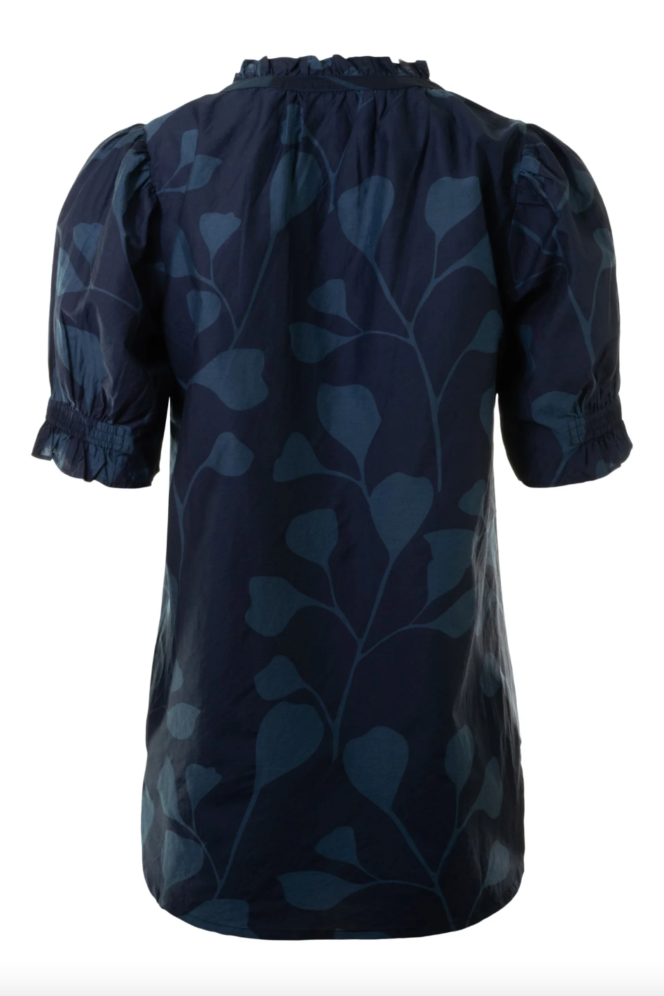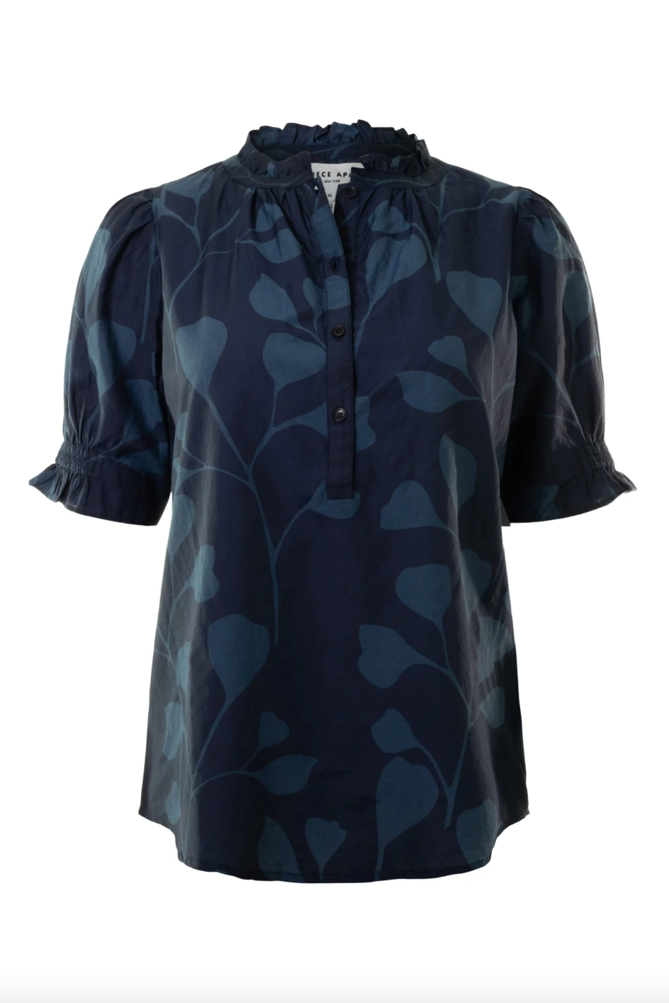 The Los Altos Top in Indigo Trellis is crafted from a luxurious blend of cotton and silk. The elbow sleeves feature a delicate smocked detail, while the popover style is accentuated by a button placket and ruffle collar. Experience comfort and style in this versatile top.