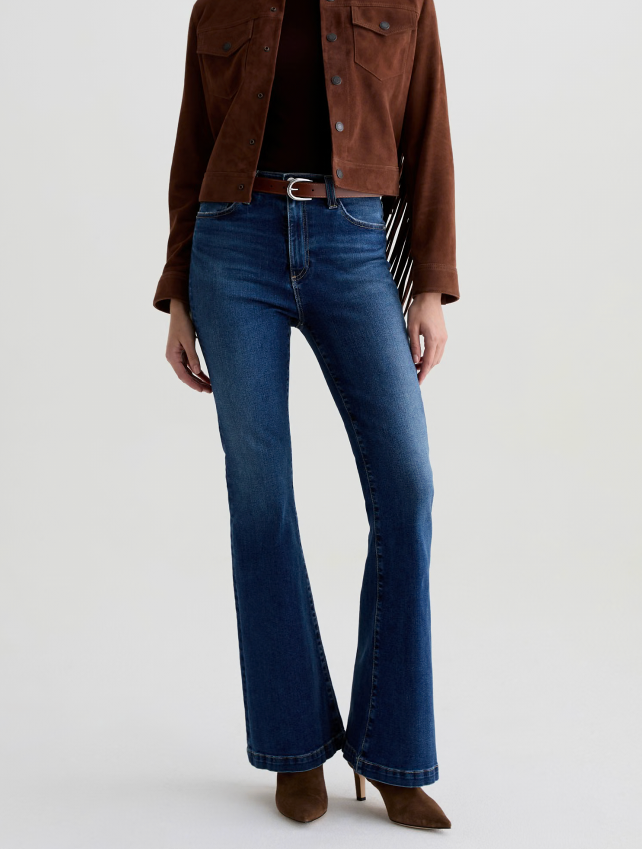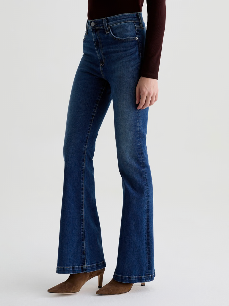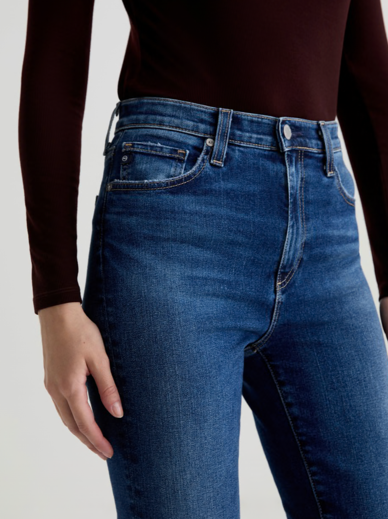 AThe Madi is a high-rise flare jean crafted from power-stretch denim. Designed to elongate the legs and hug the body with its flared-out hem design, this style combines a sleek dark wash with a flexible fit that moves with you while maintaining its shape. Crafted from premium denim sourced from Japan’s Kaihara Mill.