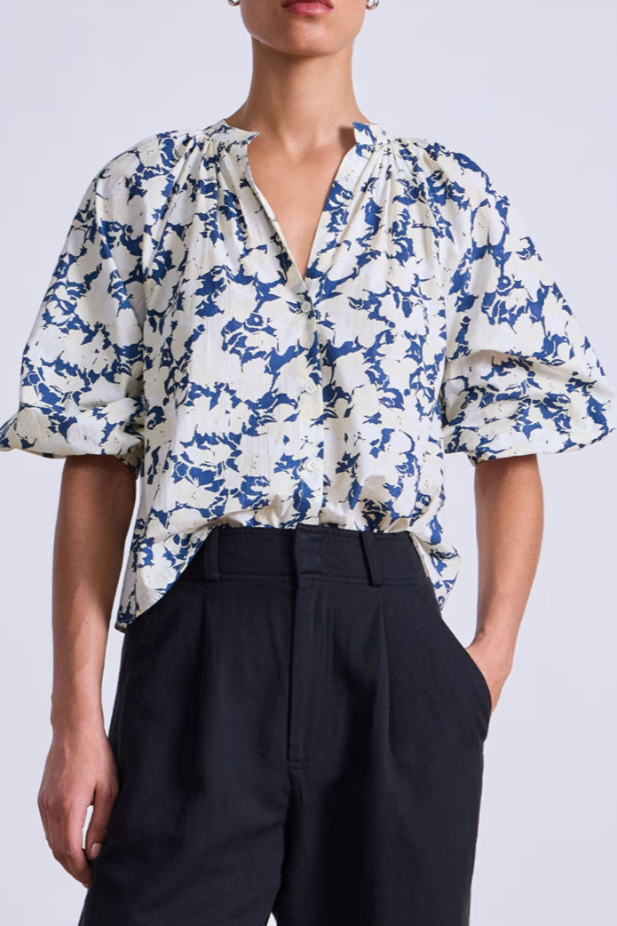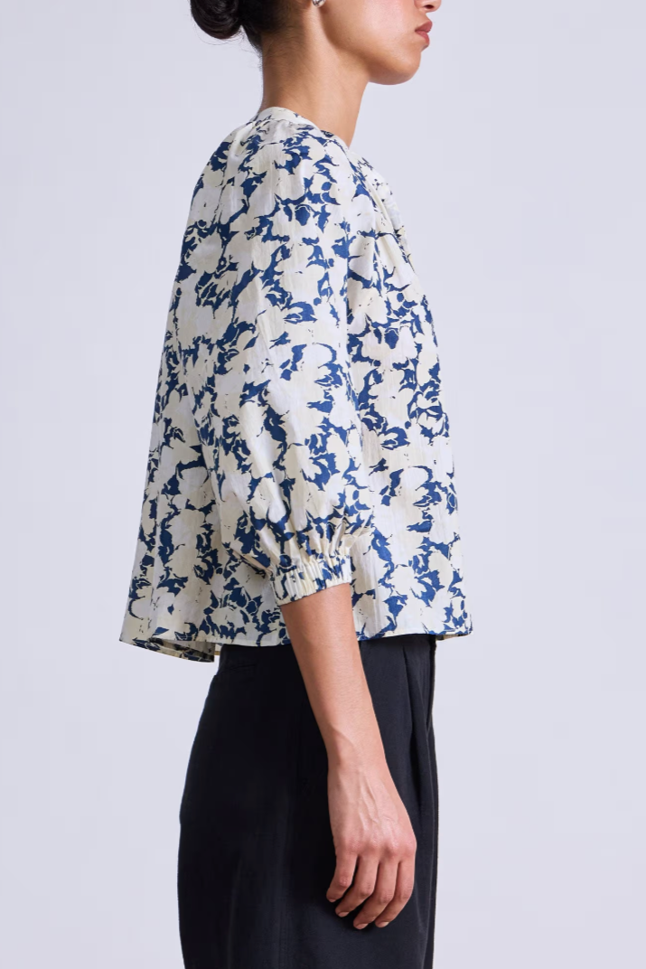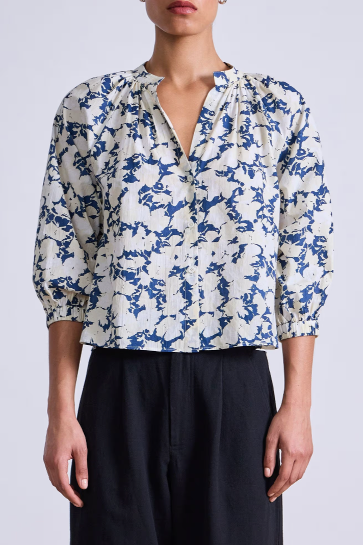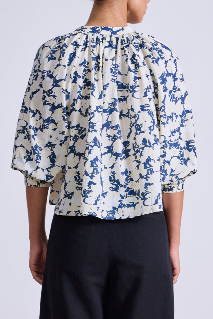 - Front button closures, raglan sleeves with slight puff, straight silhouette
