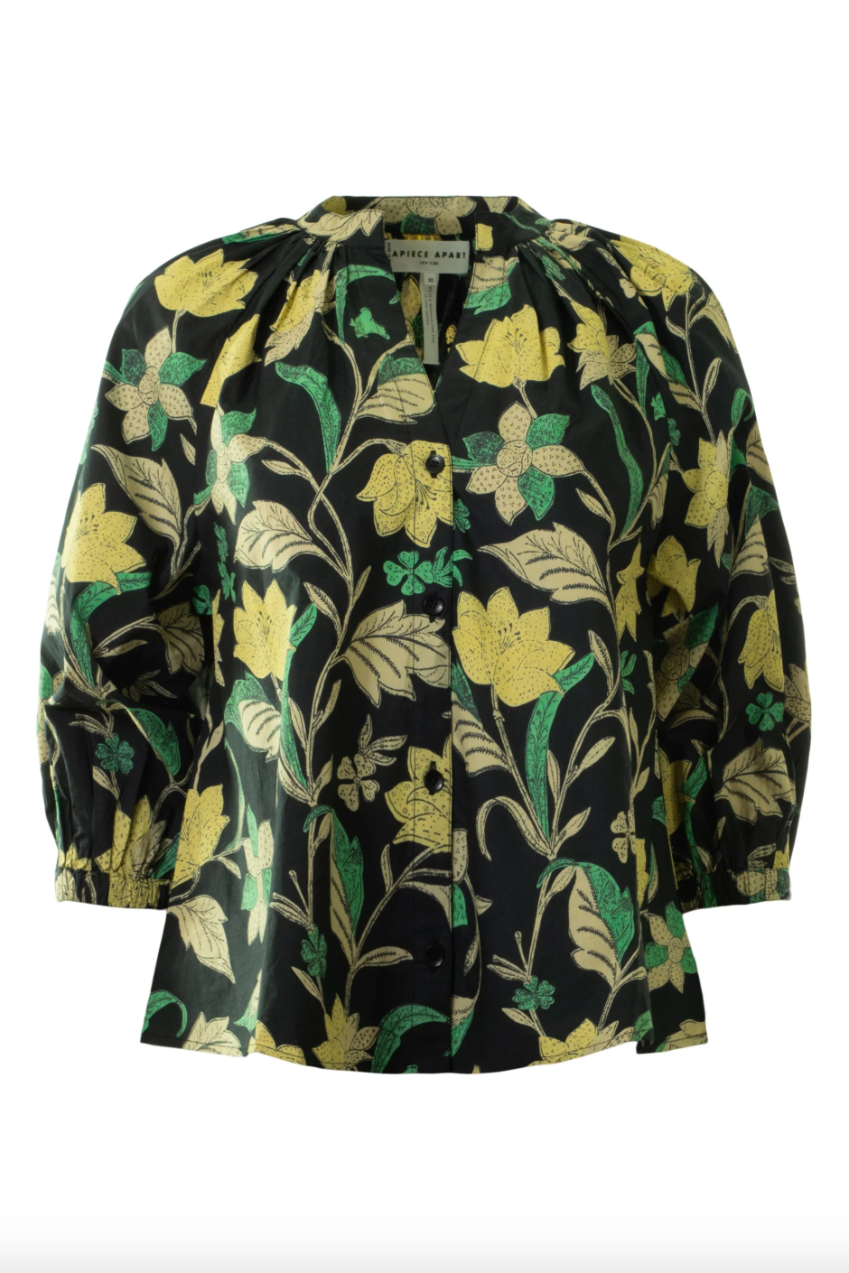 - Front button closures, raglan sleeves with slight puff, straight silhouette