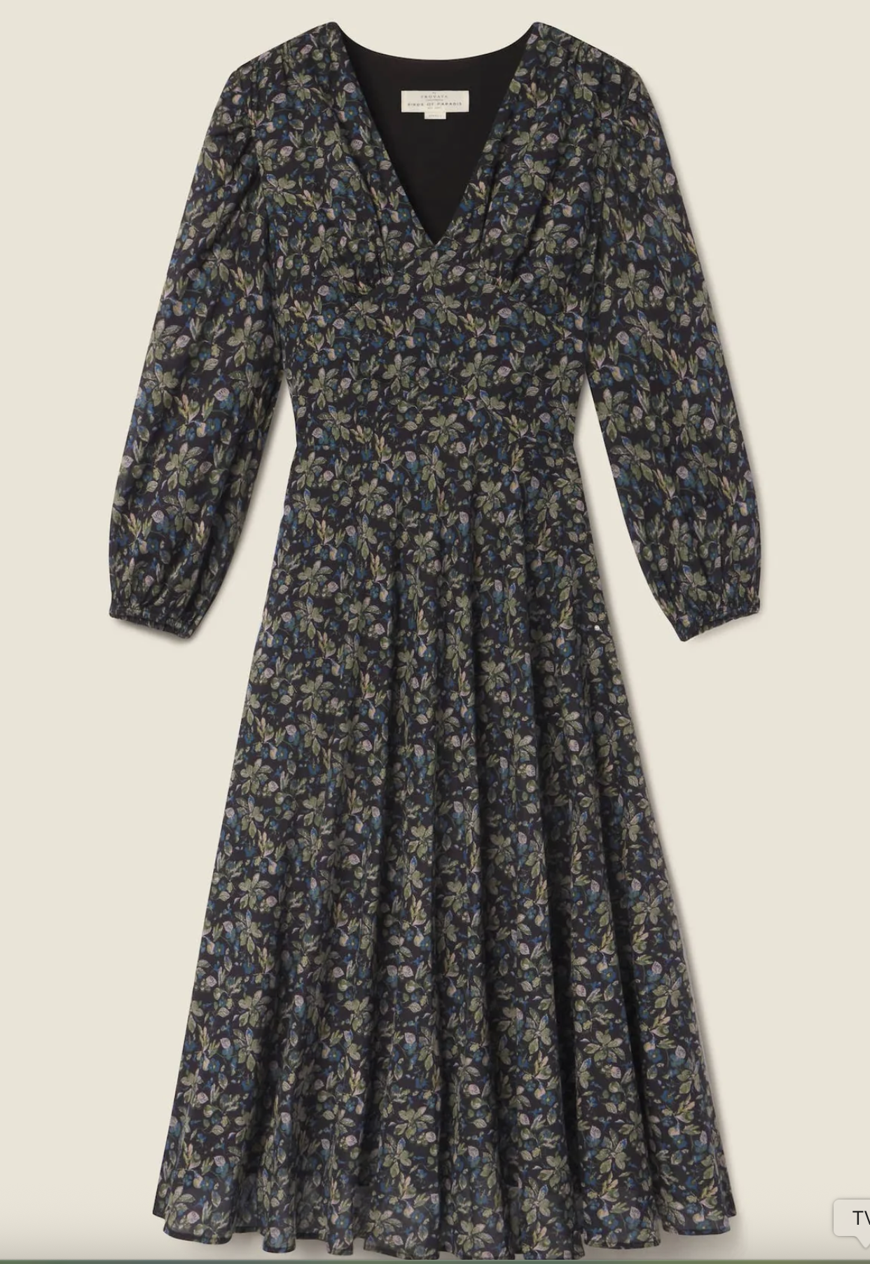 The Orion Dress is a simplified midi-length dress with a flattering v-neckline and an engineered elastic waist for a comfortable fit. Long sleeves are met with self-fabric elastic for a comfortable and adjustable fit. Hidden side seam pockets offer additional functionality. Shown here in Orchard Frost and made from our soft cotton.
