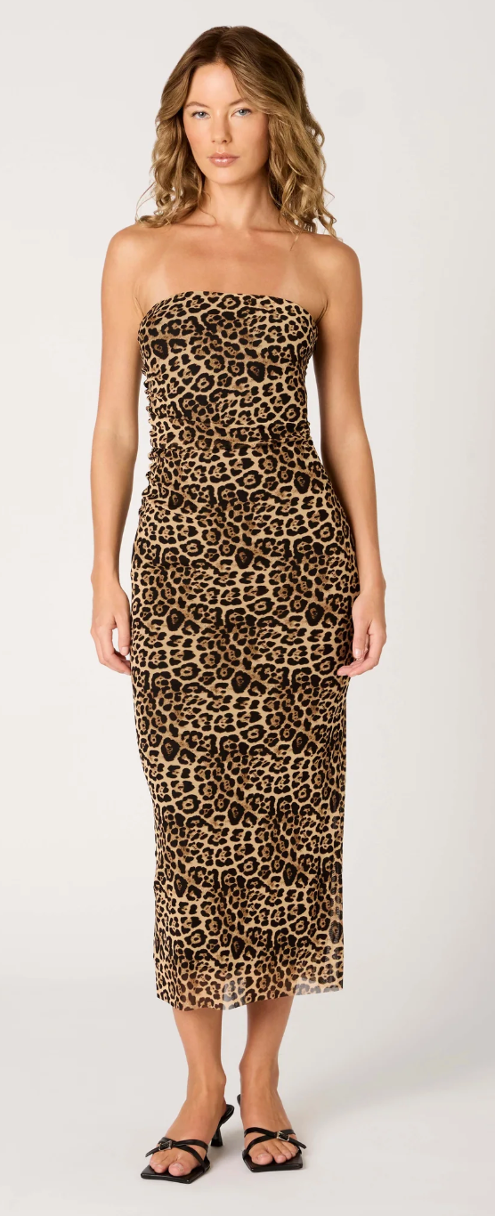 The Rowa Dress is a strapless mesh midi with a curve-tracing silhouette and subtle side ruching for shape. Designed with a sheer mesh overlay, it offers coverage while keeping a lightweight, sculpted feel. The clean straight neckline and pull-on construction make it sleek from every angle.