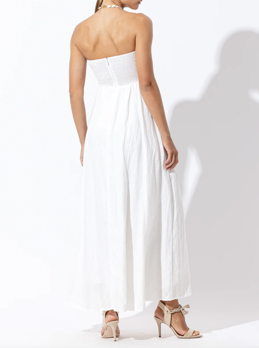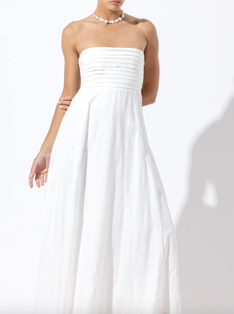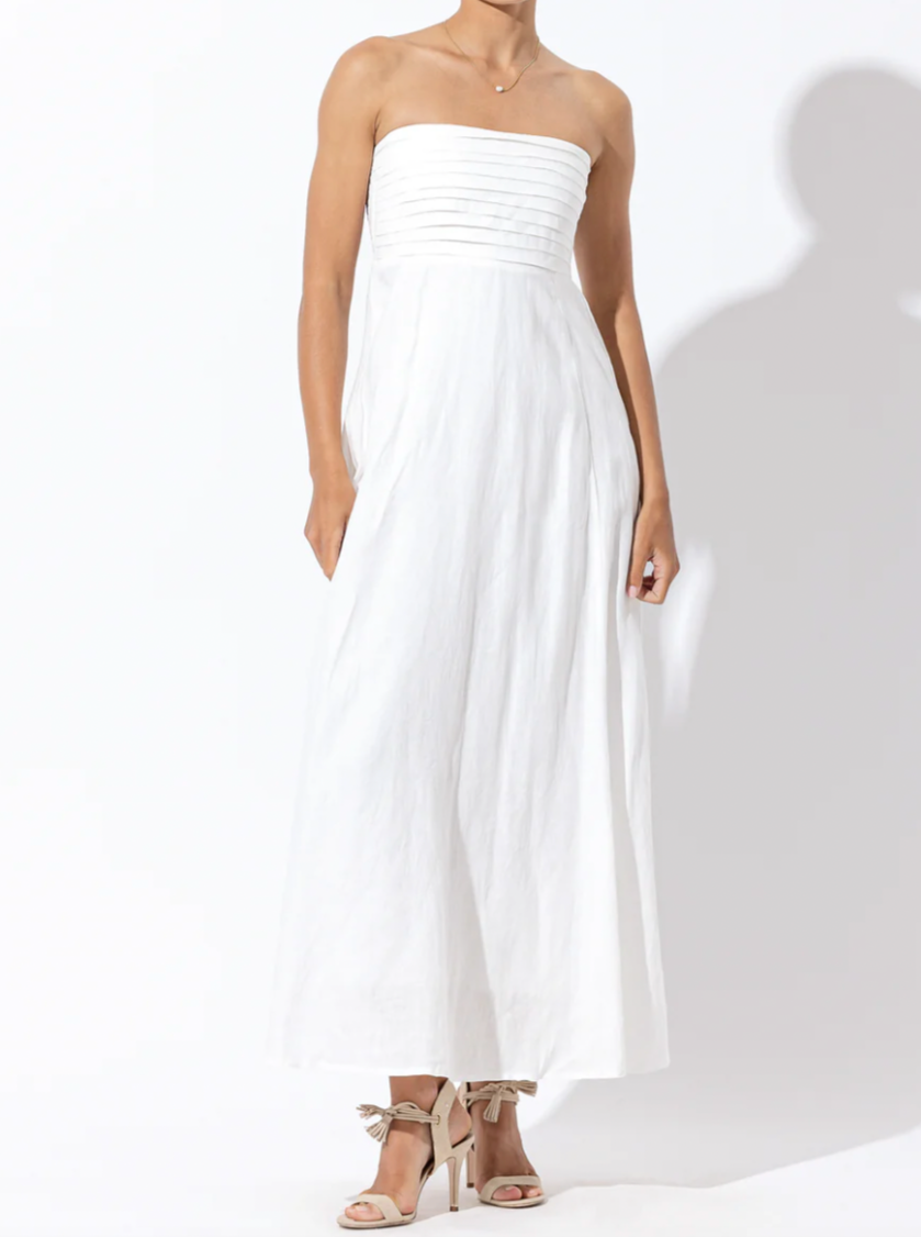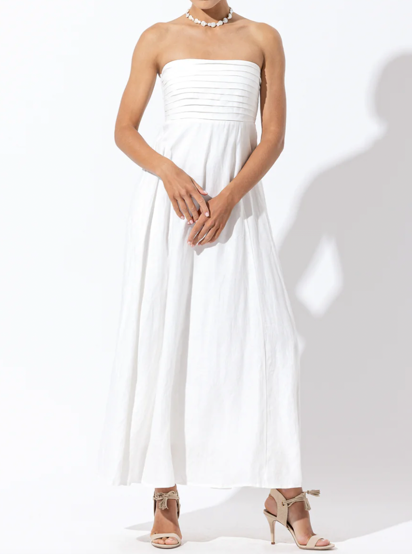Get ready for a stylish wedding with Talia Linen Midi Dress in White. Strapless design with pintuck detail bodice and A-line skirt. Easy to wear with a shirred back and zipper.