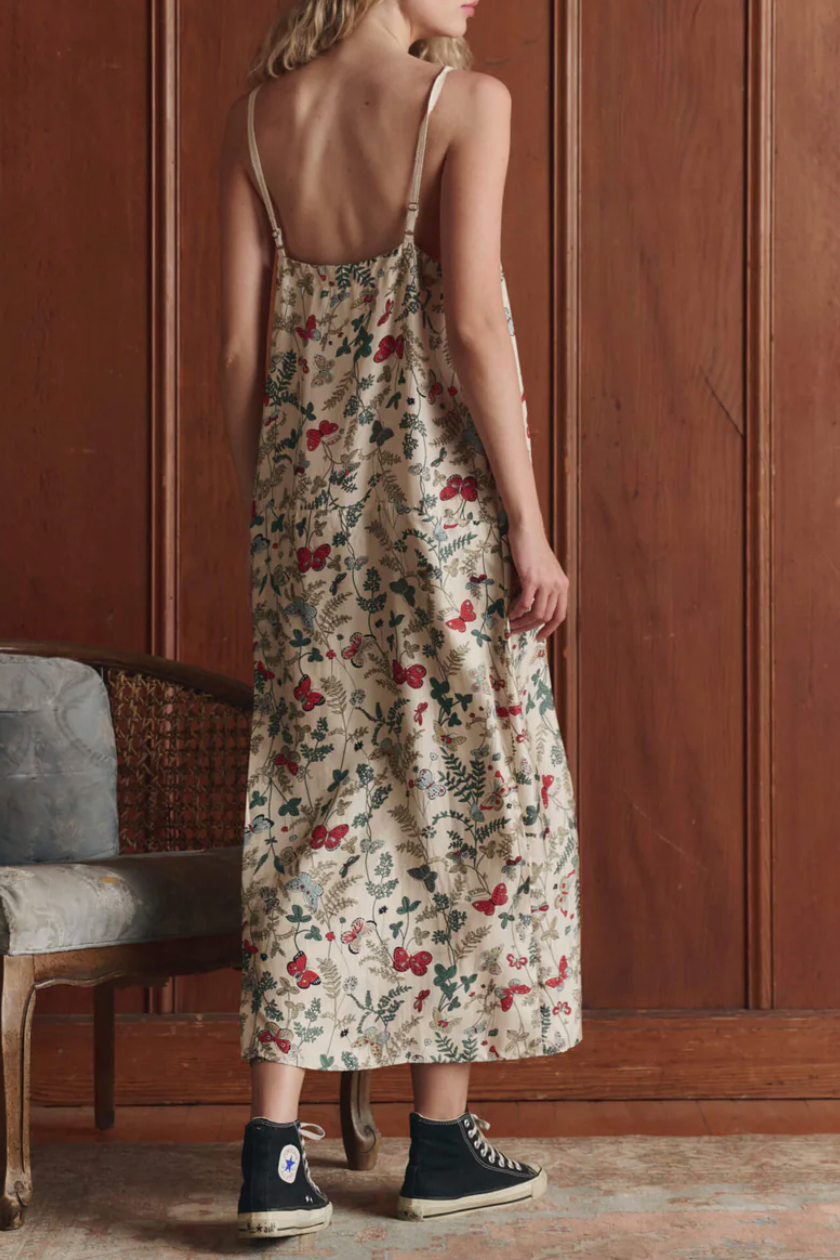 The Sundrift Slip Dress draws inspiration from 1920s design. It features a straight silhouette with a triple bust dart, double-layer split back panel, and cotton ladder-stitch trim at the shoulders. Made from lightweight silk twill with a Floating Butterfly Print. Timeless and whimsical.