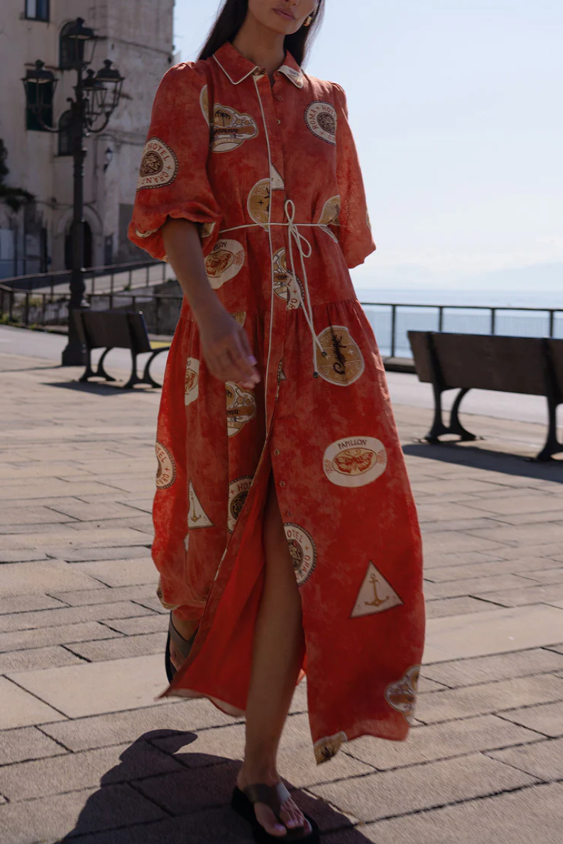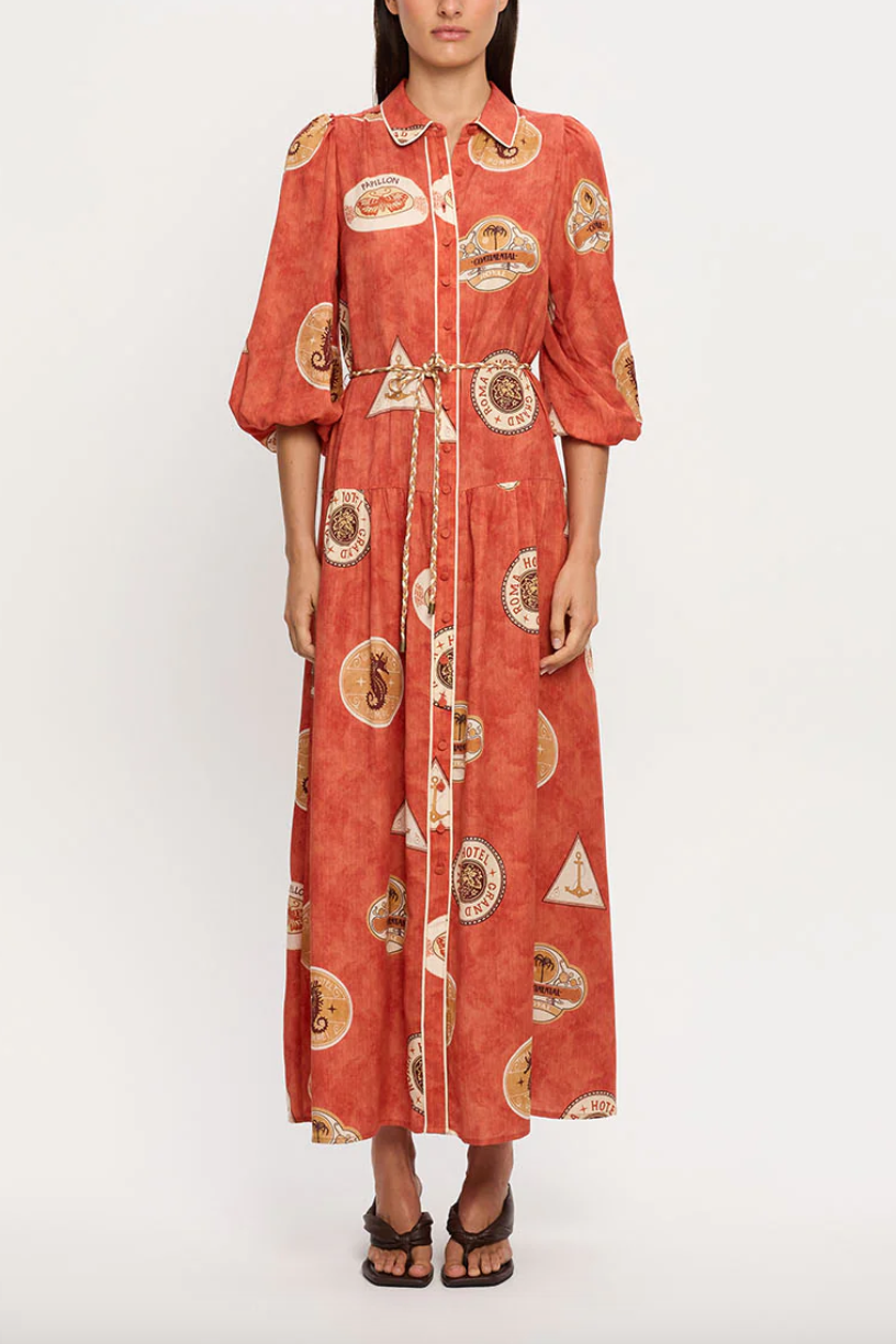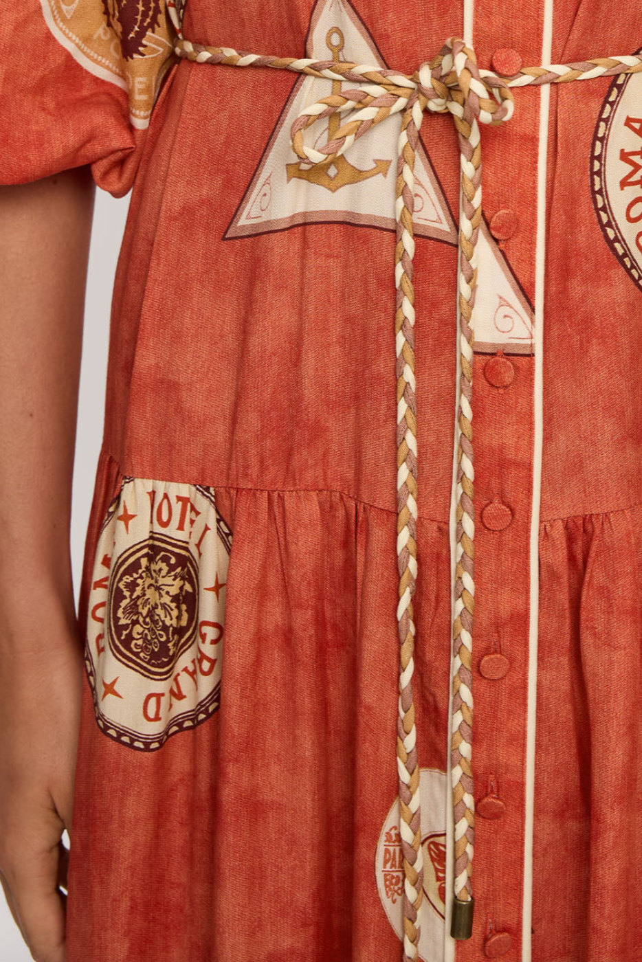 Vacanza is vintage motifs set against a rich, warm red base. The Vacanza Maxi Dress features a slight blouson sleeve, button down front, complete with a removable braided belt.
