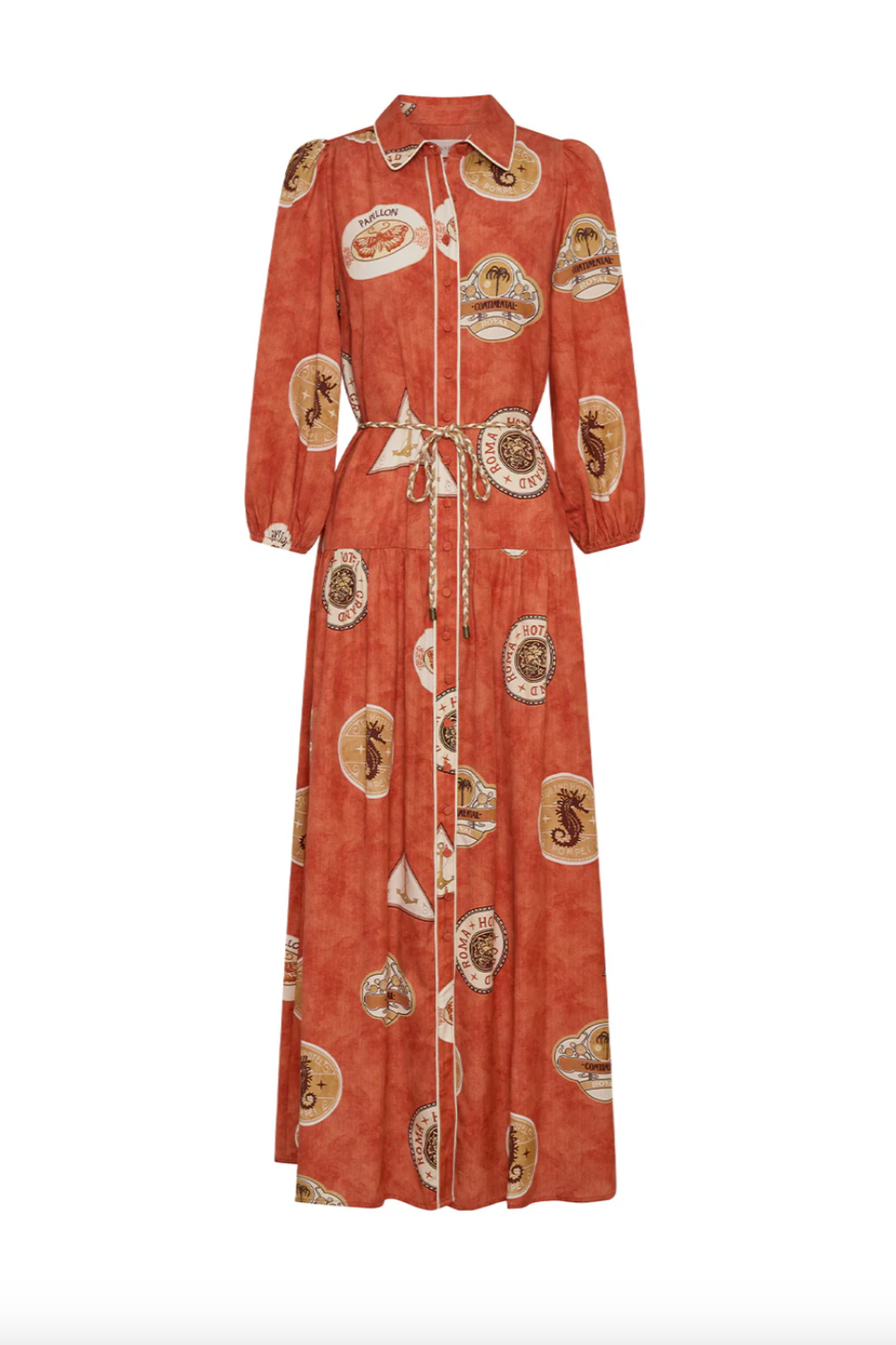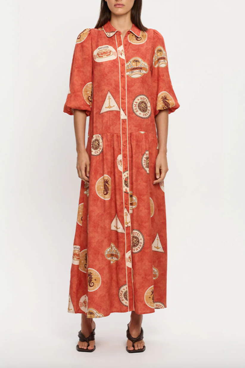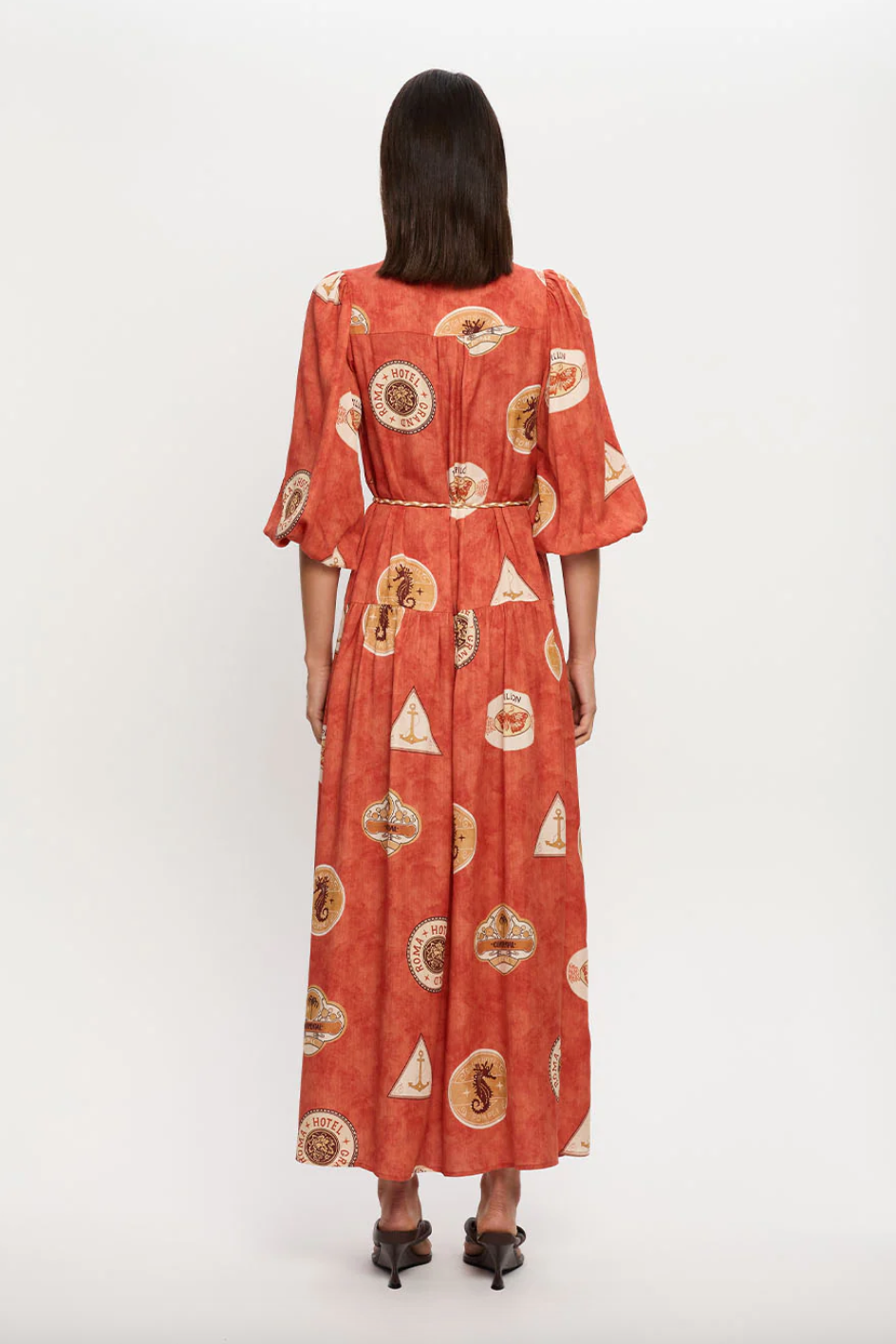 Vacanza is vintage motifs set against a rich, warm red base. The Vacanza Maxi Dress features a slight blouson sleeve, button down front, complete with a removable braided belt.