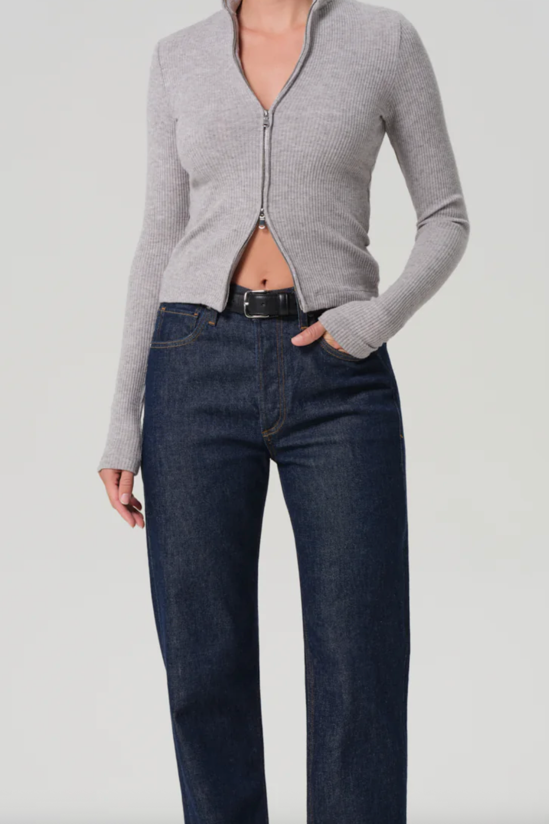 The Zip Cardigan is crafted from super soft sweater rib with the perfect amount of stretch. The light heathered grey silhouette features a fitted long sleeve design with a full zip front, offering a clean, polished look. Perfect layered over tees or worn alone with tailored pants for versatile styling.